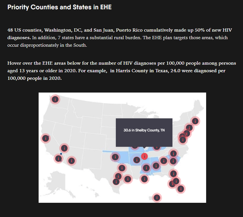 Another interactive element used throughout the modules is the hot spot feature on images. Providers can hover over a hot spot to view additional relevant information to that area within the image. In module 1, we used this feature to show the number of HIV diagnoses within each EHE priority county.