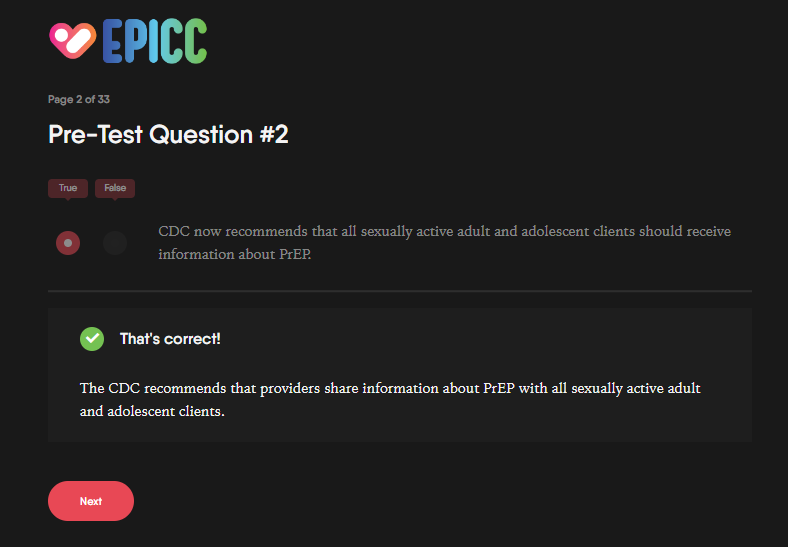 This module provides an overview of the 2021 CDC PrEP Guideline changes, PrEP screening process, CDC HIV testing recommendations, and PrEP navigation needs. Each module contains pre-test questions to help providers understand where they may have PrEP knowledge gaps. We also include a brief explanation on why the answer selection was correct or incorrect. The screenshot below is an example of a pre-test question with an explanation of a correct answer.