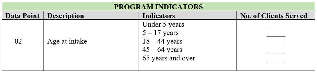Age at intake: Indicate the number of individuals represented by each age range. This indicator should be the age at which an individual entered the SASIC Program and completed the intake assessment. If the individual is a child and is unable to provide this information, the child’s parent or guardian may provide the information.