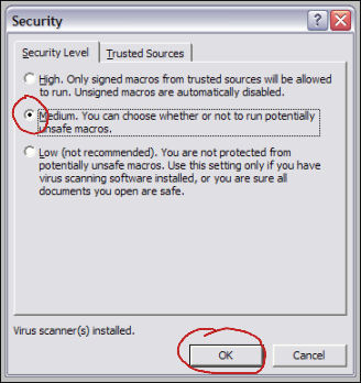 | 2. Select your macro Security Level: either "Medium" (recommended) or "Low" (not recommended). |
