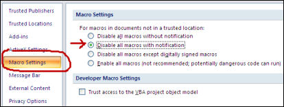| 4. In the next window, select "Macro Settings," then select the radio button for "Disable all macros with notification." |