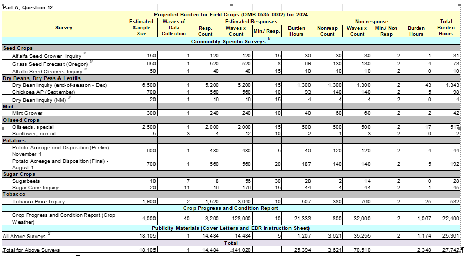 The Row Crop County Estimate Survey for Crop Year 2024 has been reinstated following a previous decision to discontinue it. This non-substantive change will reinstate the survey. The total burden for the Row Crop County Estimate Survey has been adjusted back to the OMB-approved hours of September 25th, 2023, which were 24,071 hours. The Annual Cost to the Federal Government has been adjusted to $11.85 million. Additionally, the total burden hours for the ICR will be increased to 129,676 from 111,621. However, the approved questionnaire content will remain unchanged.