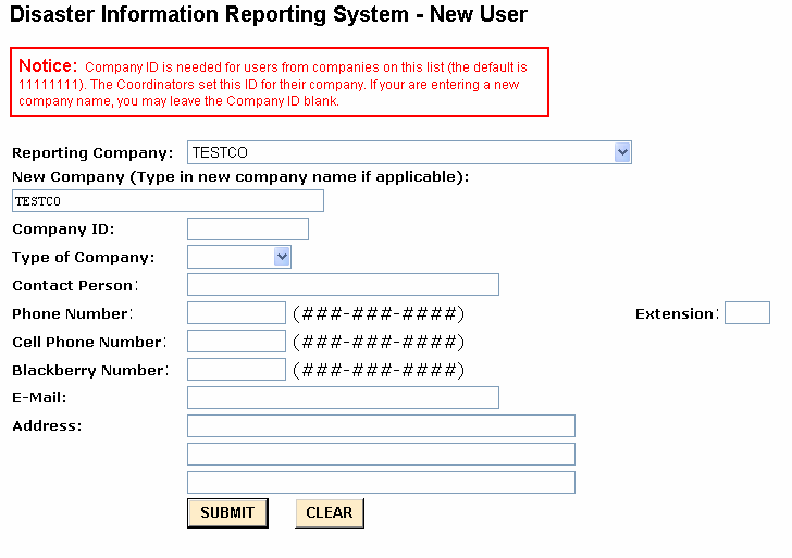 If someone from your company has User ID or has filed a report, your company will be listed in the scroll down menu under the Reporting Company. You will have to choose that company and know the Company ID (or password). The Company ID is controlled by the report coordinators for your company (if your company has report coordinator(s)). The initial value for it is 11111111. The Company ID is DIRS’ way to prevent any unauthorized person from saying that he/she is from your company. If your company is not in the scroll down menu, please give the name of your company. You will not have to provide a Company ID in this case.