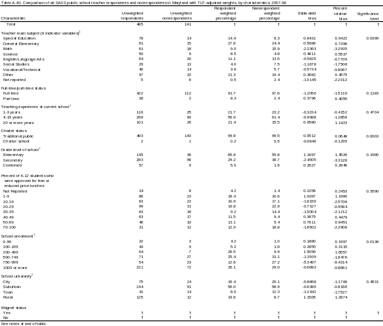 The final-weighted state table for Maryland (described at the end of this appendix) shows that there are eighteen characteristics with significant (+/- 5) percent relative bias. There was significant TLF nonresponse bias for schools with the following characteristics:
