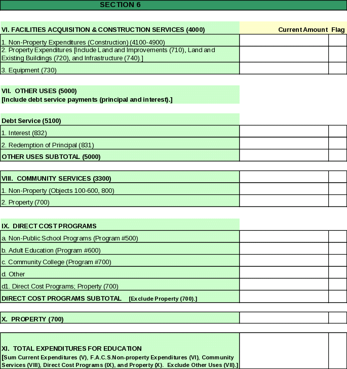 Totals are reported for current expenditures and total expenditures (sections V and XI, respectively). Current expenditures are those for day-to-day operation of schools. They exclude debt repayment, capital outlays such as construction, and programs outside the scope of PK–12 education. Total current expenditures include all expenditures.