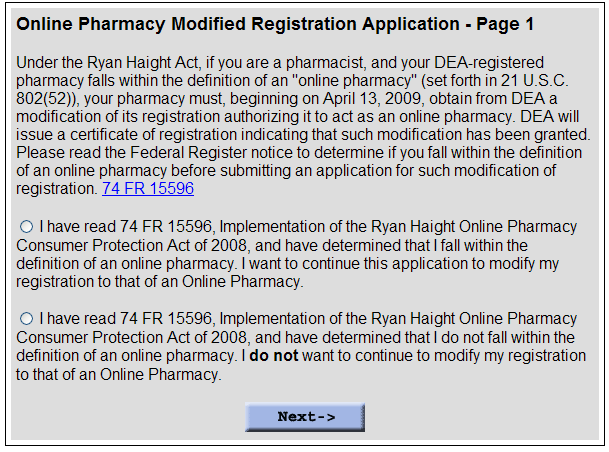 Application for Registration-DEA 224, App for Reg Renewal-DEA 224a, Affidavit for Chain Renewal DEA Retail Pharmacy Reg-DEA 244b, Application for Modification of Reg for Online Pharmacies-DEA 224c