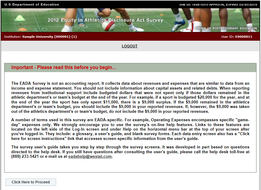 Your institution’s specific data entry screens are determined by your responses to the Screening Questions. You will not see screens that do not pertain to your institution. That is, if your institution has women’s sports teams only, you will not see screens for men’s or coed teams. However, instructions in this user’s guide address men’s teams, women’s teams, and coed teams. Please apply the information as appropriate for your school. For example, if you have women’s teams only, follow the instructions that apply to women’s teams and ignore the instructions that apply to men’s teams and coed teams.