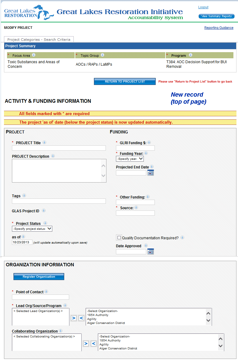 Figure 5. Screen shot of the project, funding and organization areas for a new project.