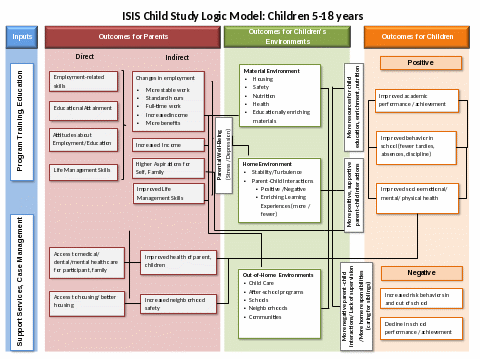 Theory of Change for ISIS Program Impacts on Children. The body of experimental research on welfare reform strategies offers little evidence about the pathways from direct impacts on parents, such as increased income, employment, or education, to improved outcomes for children. In this section, we describe a logic model illustrating hypothesized pathways from impacts on parents to impacts on children, which is based on largely correlational research about the associations of parental income, employment, and education with children’s environments and the associations of children’s environments and interactions with their developmental outcomes.