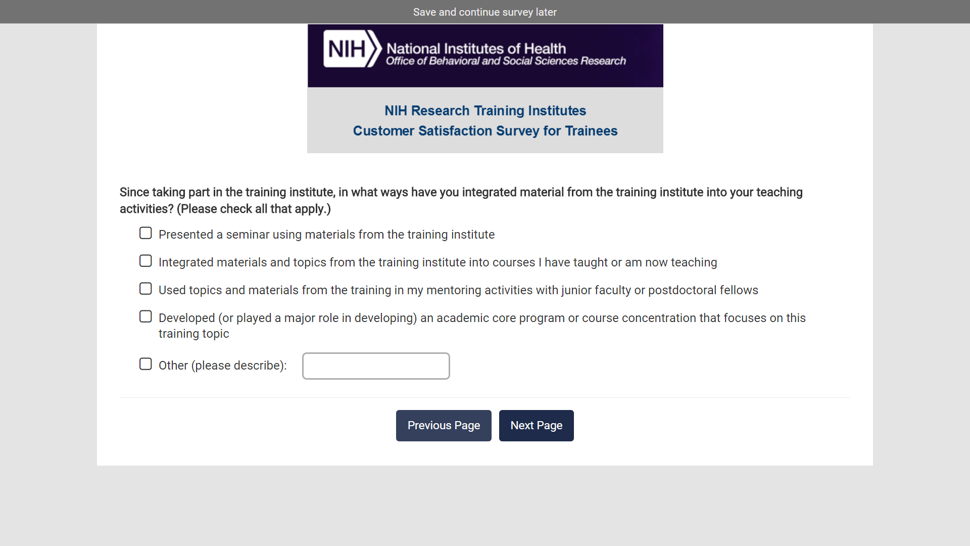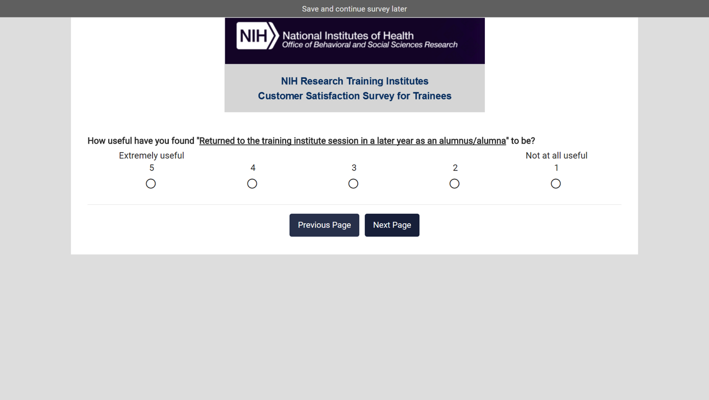 If the respondent selects “yes” instructions will pipe in the institute and year so that it will read “Please refer to your experience attending the [Institute] in [Year] for the remainder of this survey”.