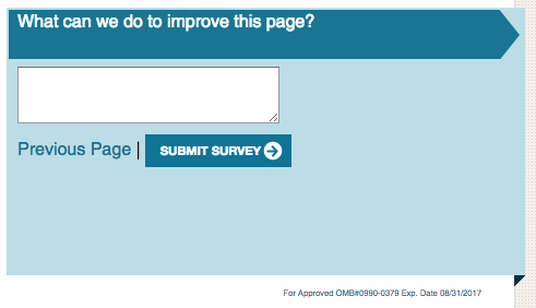 Below are examples from 3 HHS agency websites that use the Voice of Consumer (VoC) survey tool. The screenshots included illustrate how ODPHP website surveys will be situated on the site and how the surveys will be structured at the site level and page level.