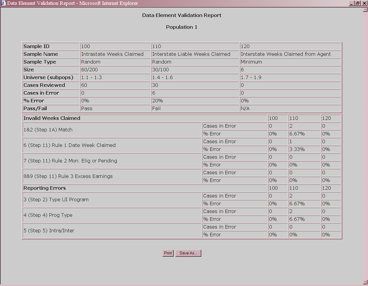 The Benefits application uses random, missing, minimum and outliers samples for the DEV process. The Tax application uses minimum samples, formerly known as “File Integrity Validation” or FIV samples, which consist of two records per sub-population within an extract file. The sample frame for each sample consists of a set of specific sub-populations within an extract file. Records included in a sample are displayed along with the data elements to be validated in a data entry screen. Investigators review each record, identify any elements found to be erroneous, and data-enter this information into the system. In Tax, even one error causes a sample to fail.