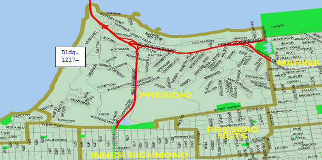 From 25th Ave.From 25th @ El Camino Del Mar Blvd., enter Presidio. You will be on Lincoln Blvd. Turn right at Kobbe St. and turn left on Upton Ave. Turn right on Ralston. You will see USPP Bldg. 1217.