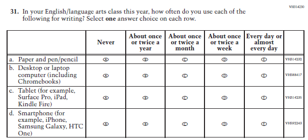 Given that approximately 25% of write-in responses for other piloted technology items stated “Chromebooks”, “(including Chromebooks)” was added to clarify the original sub-item f (currently sub-item e). |