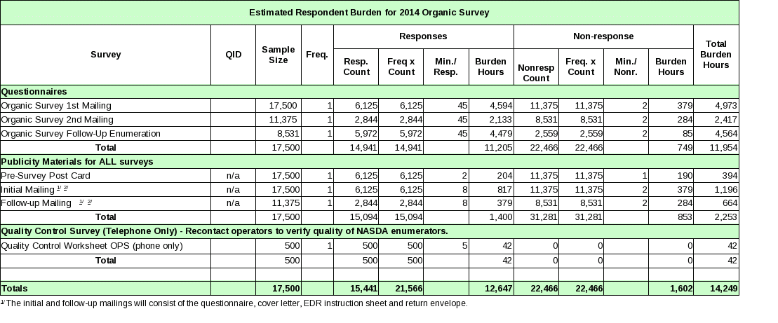 The time required to complete the Organic Survey questionnaire is expected to average 45 minutes per respondent. Time will vary since operations differ in size, scope of production, and practices utilized. Total number of positive responses is estimated to be 15,441, which is based on using an estimated annual sample size of 17,500 with an estimated response rate of 85 percent. The target population consists of certified organic producers, producers exempt from certification and transitional operations. Response burden hours are shown in the table below. There will be a postcard announcement sent out to the target operations announcing the upcoming survey. The next mailing to the respondents will contain the questionnaire, a cover letter, and an Electronic Data Reporting (EDR) mail Instruction sheet. For non-respondents, the follow up mailing will contain another copy of the questionnaire and a cover letter. NASS will also utilize telephone and personal enumeration to follow up with individuals who do not respond to the mail requests or via EDR.