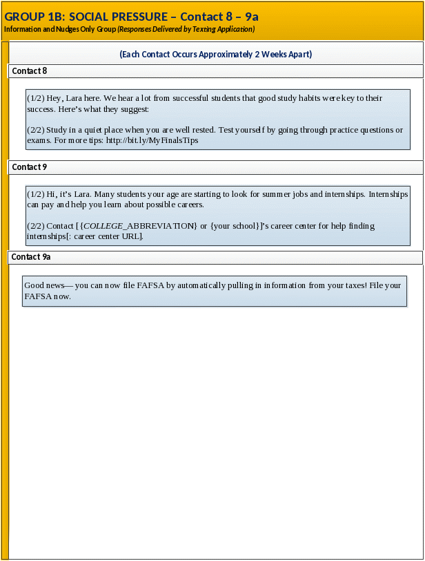 Group 1 – Information and nudges only. Students will receive automated and predetermined texts. Automated replies will be sent in response to key words included in texted responses from students. Group 1 includes three variations.