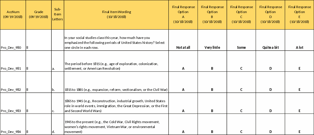 Please note that only sub-items "a", “c”, “e” will be reviewed in cognitive interviews, but the entire matrix will be shown to avoid potential confusion. Please note that the probes listed above will be asked on the condition that school administrators select response options ‘B, C’ on the specific sub-items.