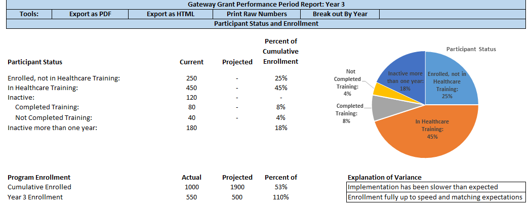 Below is the complete list of the proposed data items from HPOG Next Gen Participant Accomplishment and Grant Evaluation System (PAGES) that will feed into the Performance Progress Reports (PPRs). The PPR will consist of two sections within the PAGES system—a narrative portion that grantees will fill out in PAGES each six-month period, and a quantitative portion that will include metrics automatically generated from data that has been entered elsewhere in PAGES. The narrative portion will be taken directly from the first four pages of ACF-OGM-SF-PPR (a standard ACF form already approved by OMB under number 0970-0406; included in this attachment) and embedded in PAGES. The quantitative section will use the data items listed below. We also present a mockup of the quantitative section of the PPR.
