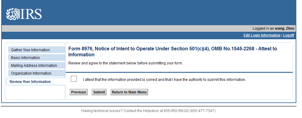 Upon returning to the Main Menu, the user will see the submitted Form 8976 under View Application Status.