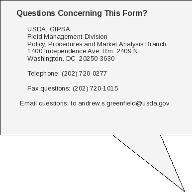 FORM APPROVED OMB NO. 0580-0013: According to the Paperwork Reduction Act of 1995, an agency may not conduct or sponsor, and a person is not required to respond to a collection of information unless it displays a valid OMB control number. The valid OMB control number for this information collection is 00580-0013. The time required to complete this information collection is estimated to average 1 hour per response and 1 minute of recordkeeping, including the time for reviewing instructions, searching existing data sources, gathering and maintaining the data needed, and completing and reviewing the collection of information.