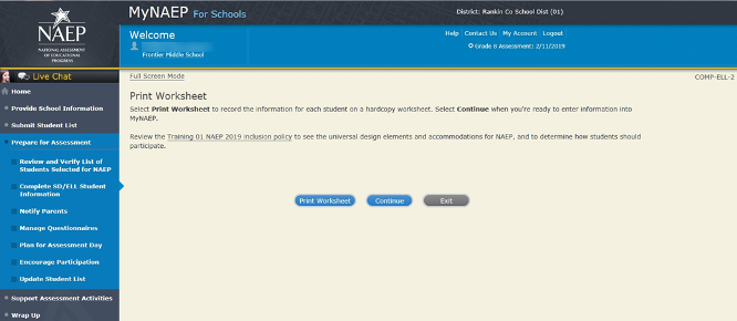 If you need assistance, call the NAEP Help Desk at 1-800-283-6237.
