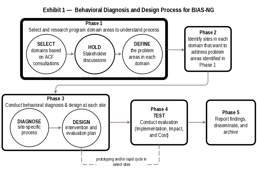 The September 2015 Executive Order “Using Behavioral Insights to Better Serve the American People” stated that “A growing body of evidence demonstrates that behavioral science insights -- research findings from fields such as behavioral economics and psychology about how people make decisions and act on them -- can be used to design government policies to better serve the American people” and encouraged federal agencies to “develop strategies for applying behavioral science insights to programs and, where possible, rigorously test and evaluate the impact of these insights.” In keeping with this directive, OPRE is conducting the BIAS-NG project. This project uses behavioral insights to design and test interventions intended to improve the operations and efficacy of human services programs. The BIAS-NG project builds on a prior OPRE project, the Behavioral Interventions to Advance Self-Sufficiency (BIAS) project, which relied exclusively on administrative data to test the short-term impact of small “nudge” interventions in human services programs. The BIAS-NG project is building on and going beyond the BIAS project by applying behavioral insights to additional ACF programs, going beyond testing simple “nudges” to include: helping programs be more self-reflective about how they present choices and options to participants; testing alternative approaches to presenting those options and, importantly, by collecting qualitative information from program staff and participants to better understand the mechanisms and effects of behavioral interventions. Information collected from interviews, focus groups, and surveys with program staff and participants will first enable the research team to better diagnose problems amenable for behavioral interventions. Based on this information, the research team will be able to design relevant interventions. Information collected during the implementation of the interventions will provide additional information as to whether the intervention was successful and, just as importantly, why or why not.