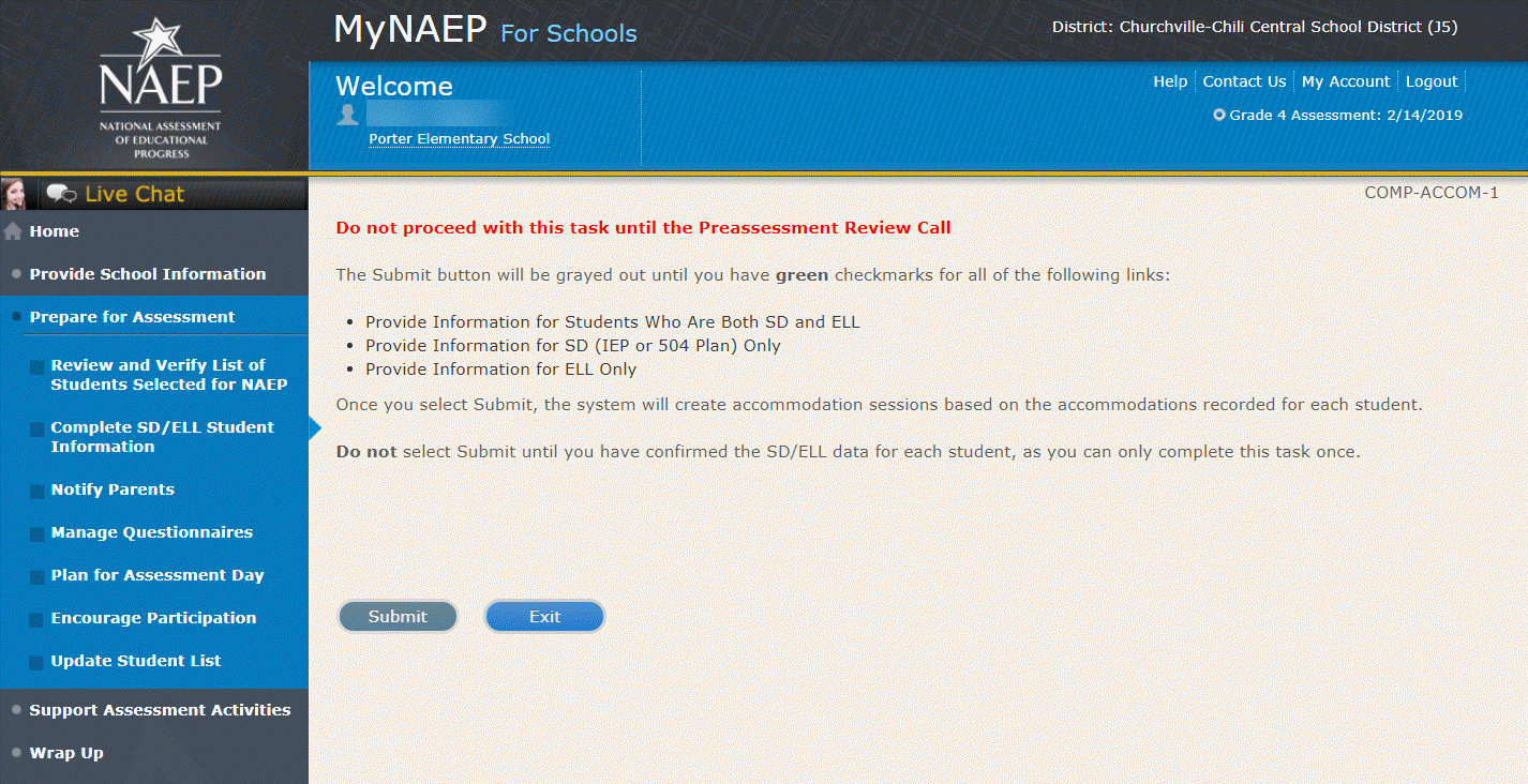 The list of students selected for NAEP will become available in early December (Note: for age 13, this will read: “September”). The school coordinator will need to complete some activities after the list is available. Completion of these activities will ensure a successful administration of NAEP. Use the links in the checklist on the left-hand menu under Prepare for Assessment to: