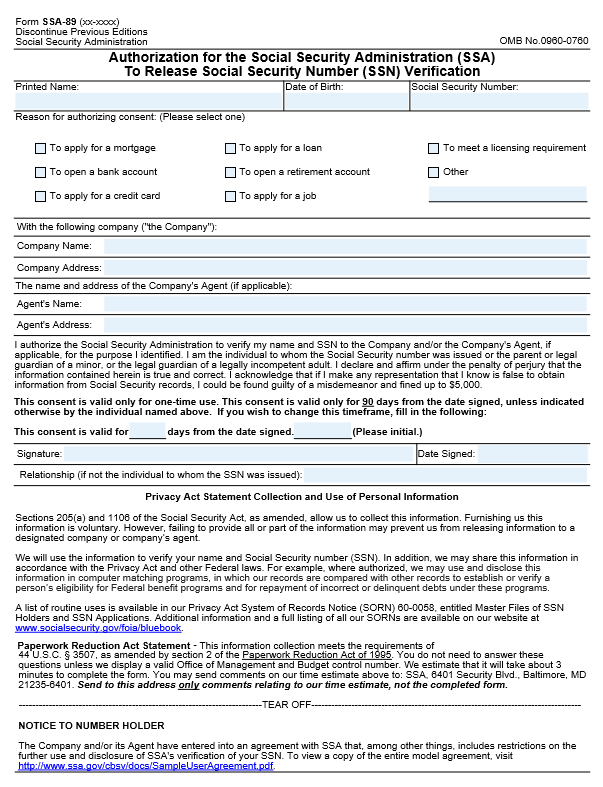Consent Form – Form SSA-89 (Authorization for SSA to Release SSN Verification & Form-SSA 89 SP Authorization for SSA to Release SSN Verification – Spanish – Attachment A). Any mention hereafter of the Form SSA-89 includes the Form SSA-89 SP.