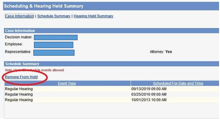 Where the claimant has agreed to a telephone hearing, go into the Scheduling & Hearing Held Summary and click the “Remove from Hold” link. It will automatically update the case back to SCHD status.