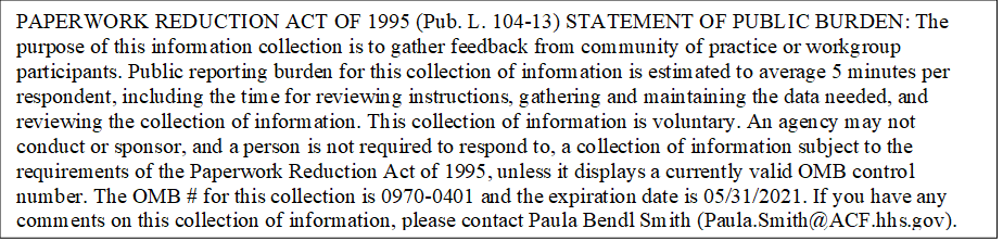 Thank you for being a member of [Community of Practice/workgroup title]. Your thoughts and suggestions are important for improving [Communities of Practice/Workgroup]. Your individual responses will be kept private. Only aggregate information will be shared. This survey should take you about 5 minutes to complete. Thank you for taking the time to complete this feedback form!