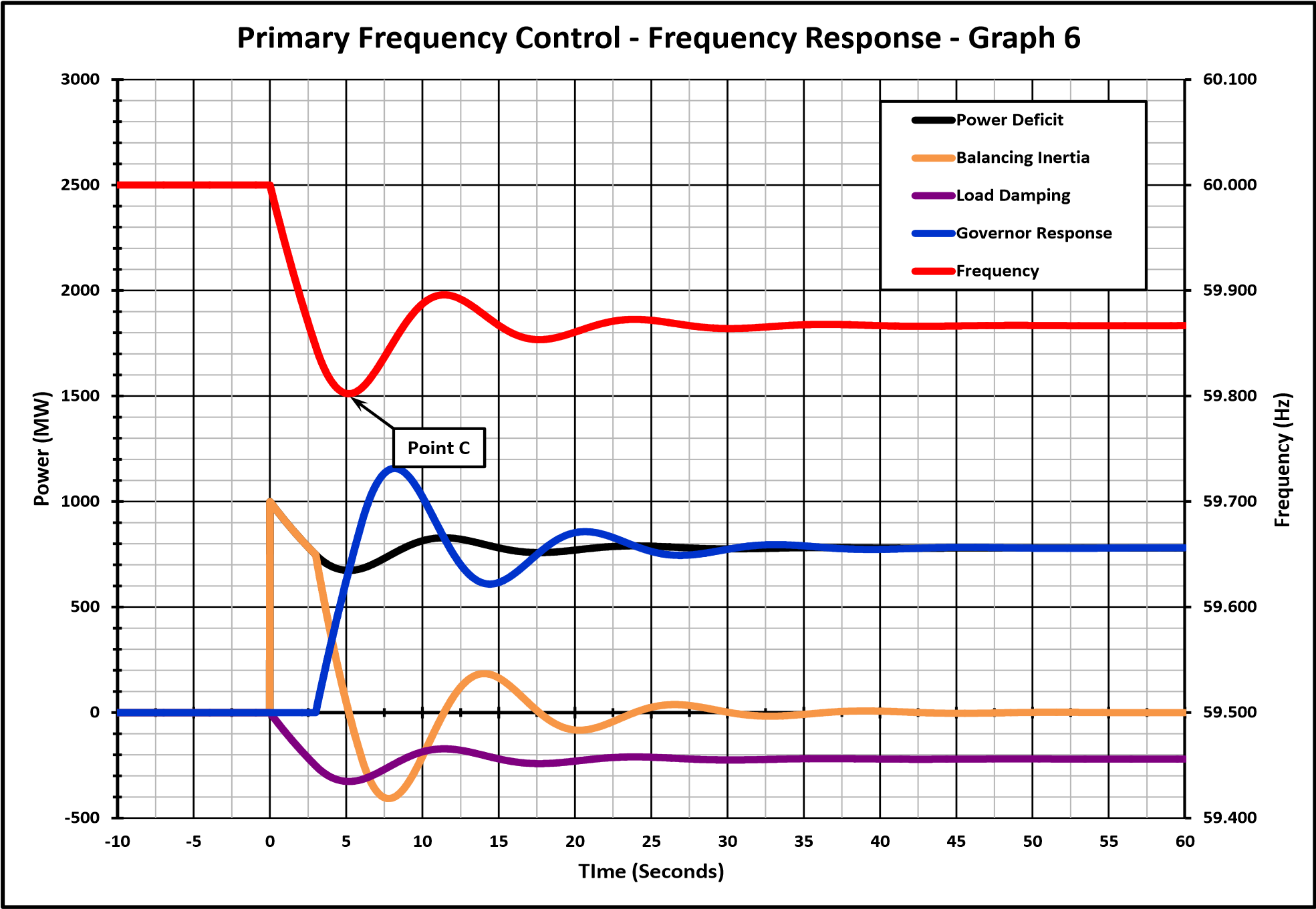 seconds specified in BAL‐003‐1. Therefore, some events are characterized with a Point C value that is only partially down the arresting period of the event and does not accurately reflect the actual nadir. BAL‐003‐1 should be modified to allow for accurate representation of the Point C nadir value if exceeding t0+12 seconds. The actual event nadir can occur at any time, including beyond the time period used for calculating Value B (t0+20 through t0+52 seconds), and may be the value known as Point C’ which typically occurs from 72 to 95 seconds after t0.