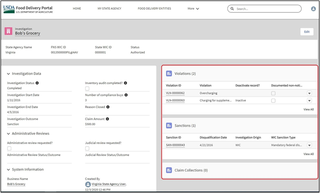 This is the screen shown to system users when they open a Violation record.