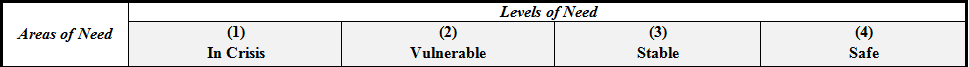 If using your own program tool, convert its assessment scale to best fit into the four levels of need in the SOT-PWI-S (In Crisis, Vulnerable, Stable, Safe) for each of the six domains (see Appendix A). Using the SOT-PWI-S scale, aggregate the client-level changes in the level of need for new and continuing clients in each domain in order to obtain program-level data for the Outcome Indicators. Do not include data for clients with only one collection point. If there are several clients who have been enrolled for more than 6 months but have not had a second assessment please provide an explanation in the program narrative report.