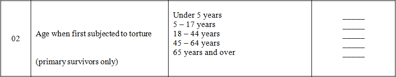 Age when first subjected to torture: The age at which the client self-reports first being subjected to torture. If the client is a child and is unable to provide this information, the child’s parent or other collateral source may provide the information.