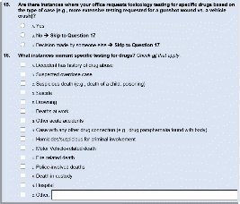 The free text responses provided in Question 13 from the 2017 NFLIS-MEC administration provided the inputs needed to create a new Question 16 (Figure 3) which asks respondents about the instances that warrant specific testing for drugs. Because this new question is a “check all that apply” option and covers the free text responses we received in 2017, as well as the feedback we received from the field via the expert panel and cognitive interviews, this two-question series will be less burdensome than the one question with an open text field.