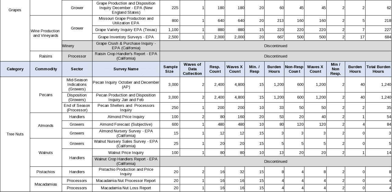 On page 3 of the table above, just after tree nuts, you will see a category for mixed which contains grapes, almonds and walnuts. The walnut data is collected only every other year. The OMB approval process is for a 3-year cycle, so the longer version of the questionnaire, which includes walnuts, will only be done once under this approval. Under the column for waves of data collection, we have done this as fractions (1/3 and 2/3) to allocate the burden hours for this 3 year approval request.