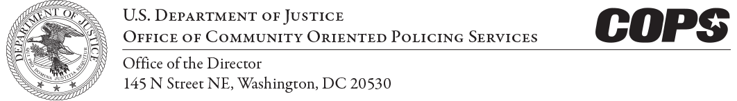 P a p e r w o r k Reduction A c t Notice: T h e public reporting b u r d e n f o r this collection of information is estimated t o b e u p t o one h a l f - h o u r p e r response, depending upon the COPS program being extended, which includes time for reviewing instructions. Send comments regarding this burden estimate or any other aspects of the collection of this information, including suggestions for reducing this burden, to the COPS Office; and to the Public Use Reports Project, Office of Information a n d R e g u l a t o r y Affairs, Office o f M a n a g e m e n t a n d B u d g e t, Washington, D. C. 2 0 5 0 3.