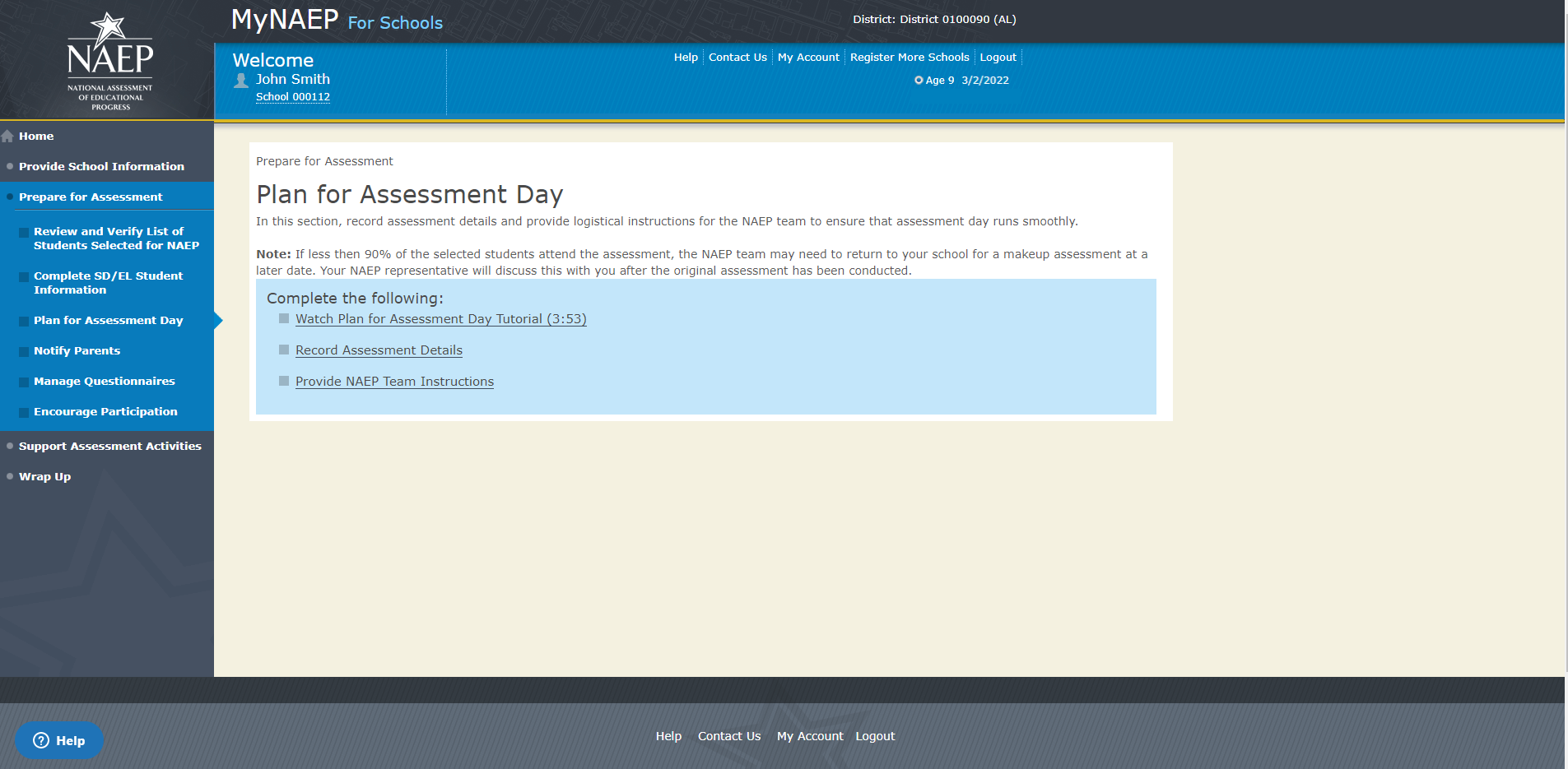 Description of MyNAEP: The school coordinators are responsible for preparing for the Long-term trend (LTT) assessment in their school using the MyNAEP system, which is an online secure site that provides participating schools with a convenient way to prepare for the upcoming assessment. MyNAEP serves as the primary resource and action center throughout the assessment process. The site also offers school coordinators an electronic way to prepare for the assessment at their own pace. The NAEP field representative will schedule an initial call to pre-review the major areas of the MyNAEP system with the school coordinator. A description of the tasks completed in the MyNAEP system can be found in Part B. The content of the MyNAEP system is included in this appendix.