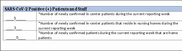 NOTE: Newly confirmed SARS-CoV-2 in-center patients and newly confirmed SARS-CoV-2 home patients must equal the number of positive tests reported for the current reporting week. (See Test for SARS-CoV-2 Infection section for reporting instructions.)