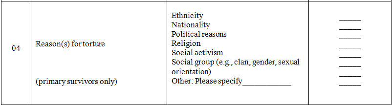 Indicate only the number of new and continuing primary clients who report being tortured for one or more of the reasons listed. These counts can be duplicated if a client reports multiple reasons for torture. If one reason significantly overlaps with another, list only the primary reason. If clients report a reason for torture that cannot be categorized into any of the options listed, please specify the reason(s) under “Other” and include a count for each reason specified.