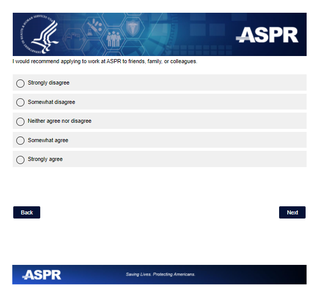 Thank you for your interest in working for the Assistant Secretary for Preparedness and Response (ASPR). We would like to ensure that applying for a job with our organization is a positive experience for our applicants. Please help us accomplish this goal by completing a short (five minutes or less) survey. Your feedback will be used to improve our hiring processes.