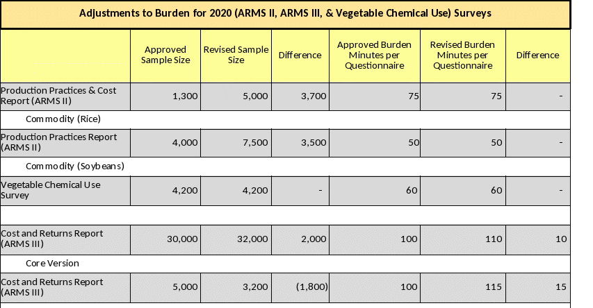 NASS conducts the ARMS program as a part of a cooperative agreement with the USDA Economic Research Service (ERS). In addition, the USDA Office of Pest Management Policy (OPMP) has provided input on the ARMS II (chemical use survey) as well as the Vegetable Chemical Use Survey. The Costs and Returns (Phase III) surveys collect both whole farm data and commodity specific data. The whole farm data can be linked to the cropping practices and chemical use data collected in the ARMS II phase. The majority of the questions that are asked in the Phase III surveys are a part of the ARMS core program and rarely have any changes made to them. The cooperative agreement allows ERS to ask additional research questions each year to address changes in the farming industry. The OMB approval process is for a three-year period, so NASS projects ahead with the surveys and commodities that will be targeted for the next three years. Each year NASS will provide changes to the questionnaires to OMB for approval. Attached to this submission are listings of the changes made to the 2020 questionnaires.