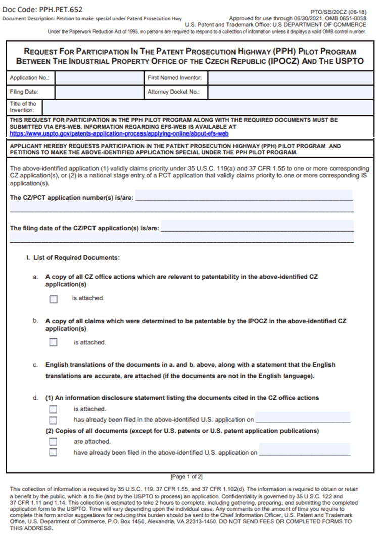 Request for Participation in the PPH Program Between the Industrial Property Office of the Czech Republic (IPOCZ) and the USPTO (Individuals or Households)