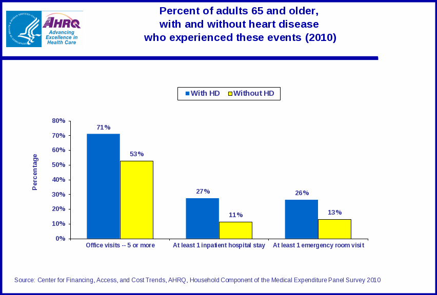 For adults ages 65 or older, having heart disease meant you were much more likely than those without heart disease to have a large number of office visits, inpatient hospital stays and emergency room visits.
