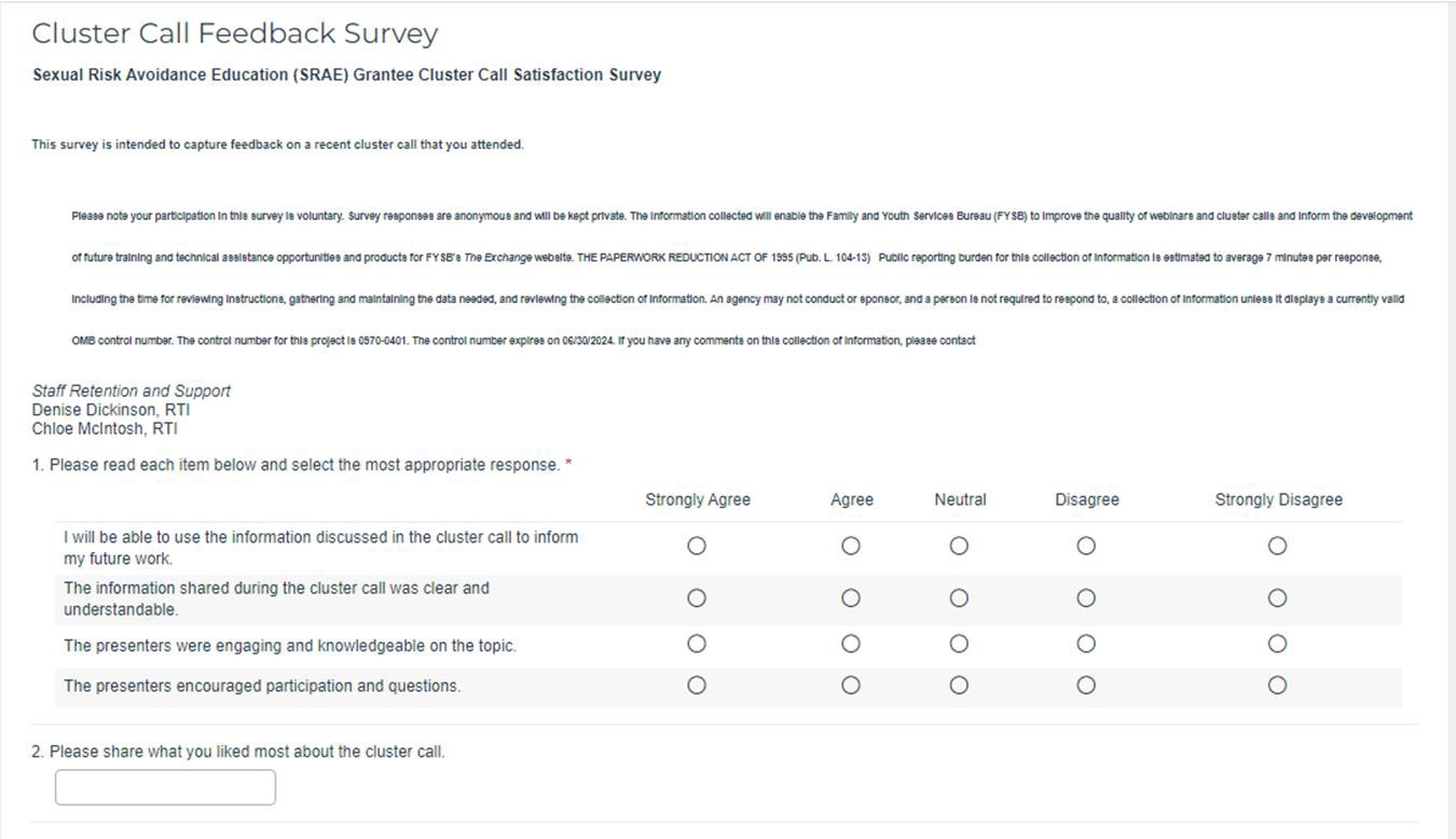 Please note your participation in this survey is voluntary. Survey responses are anonymous and will be kept private. The information collected will enable the Family and Youth Services Bureau (FYSB) to improve the quality of webinars and cluster calls and inform the development of future training and technical assistance opportunities and products for FYSB’s The Exchange website. THE PAPERWORK REDUCTION ACT OF 1995 (Pub. L. 104-13) Public reporting burden for this collection of information is estimated to average 7 minutes per response, including the time for reviewing instructions, gathering and maintaining the data needed, and reviewing the collection of information. An agency may not conduct or sponsor, and a person is not required to respond to, a collection of information unless it displays a currently valid OMB control number. The control number for this project is 0970-0401. The control number expires on 06/30/2024. If you have any comments on this collection of information, please contact Corey Palmer at Corey.Palmer@acf.hhs.gov.