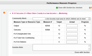 The Progress Summary section shows the target unduplicated volunteer numbers that were planned in the application. The “Actual” column calculates information based on the numbers you enter in the Performance Measure Progress section below. The “Progress” column shows your progress towards achieving the target.
