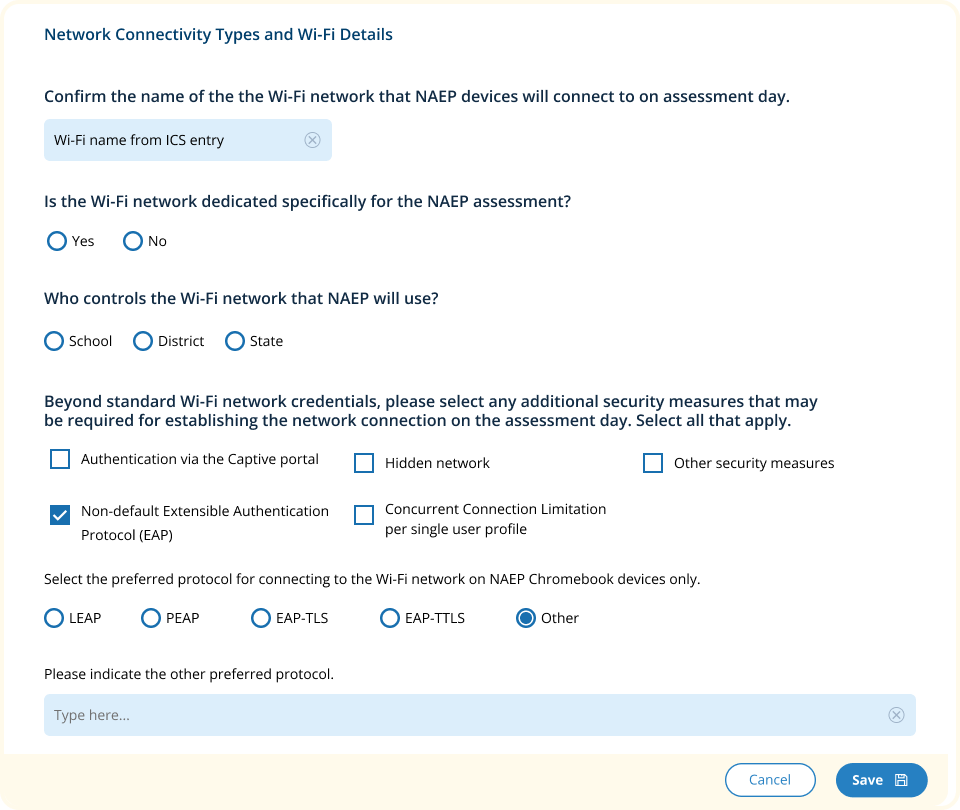 National Center for Education Statistics (NCES) conducts the National Assessment of Educational Progress to evaluate federally supported education programs. All of the information you provide may be used only for statistical purposes and may not be disclosed, or used, in identifiable form for any other purpose except as required by law (20 U.S.C. §9573 and 6 U.S.C. §151). By law, every NCES employee as well as every NCES agent, such as contractors and NAEP coordinators, has taken an oath and is subject to a jail term of up to 5 years, a fine of $250,000, or both if he or she willfully discloses ANY identifiable information about you. Electronic submission of your information will be monitored for viruses, malware, and other threats by Federal employees and contractors in accordance with the Cybersecurity Enhancement Act of 2015.
