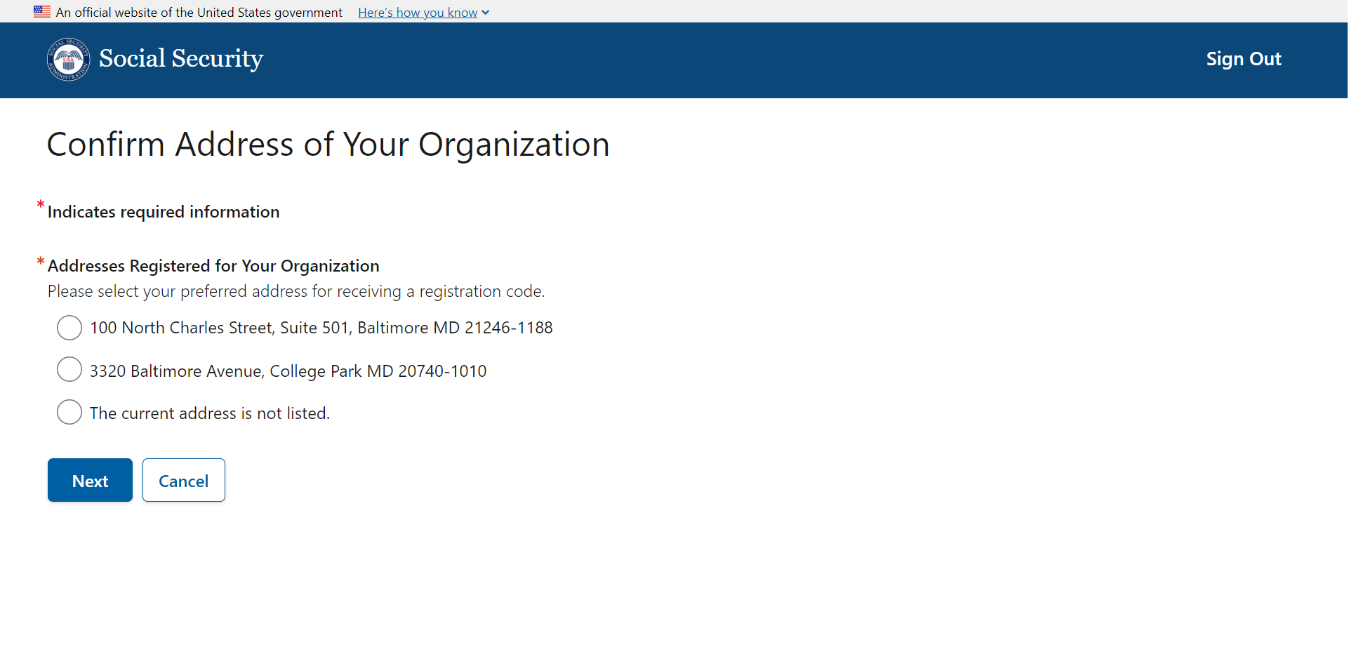 The user must confirm the address where SSA can send the registration code. The addresses presented are based on IRS data for the EIN entered.