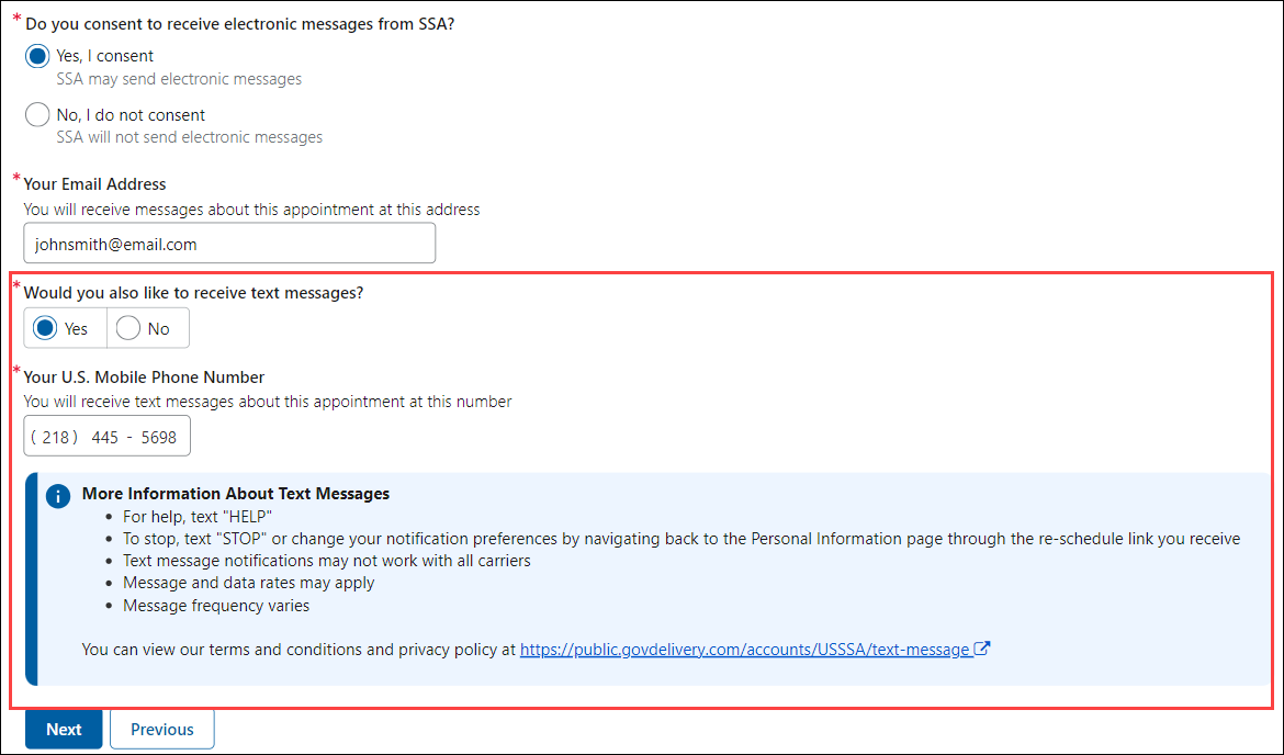 New screen display when user selects ‘Yes’ to receive text messages and to display ‘More Information About Text Messages’ after a customer consents to receive text messages.