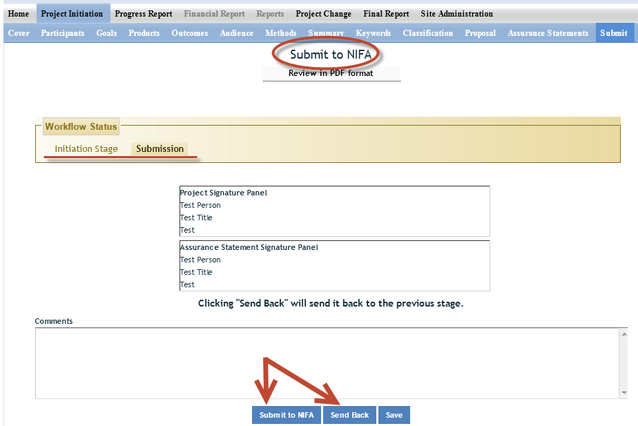 5. Click submit at the end for NIFA Review.